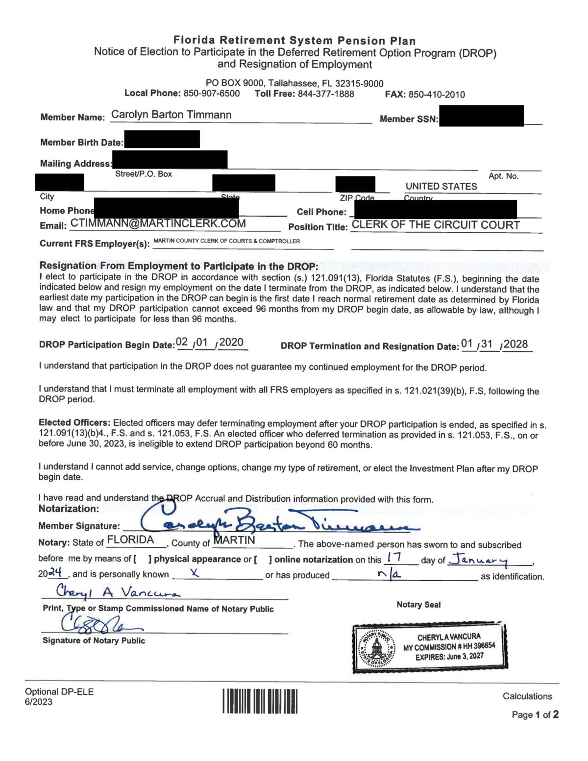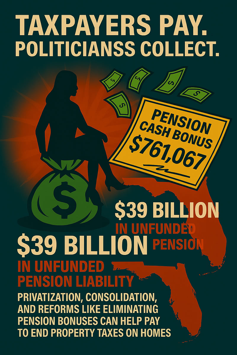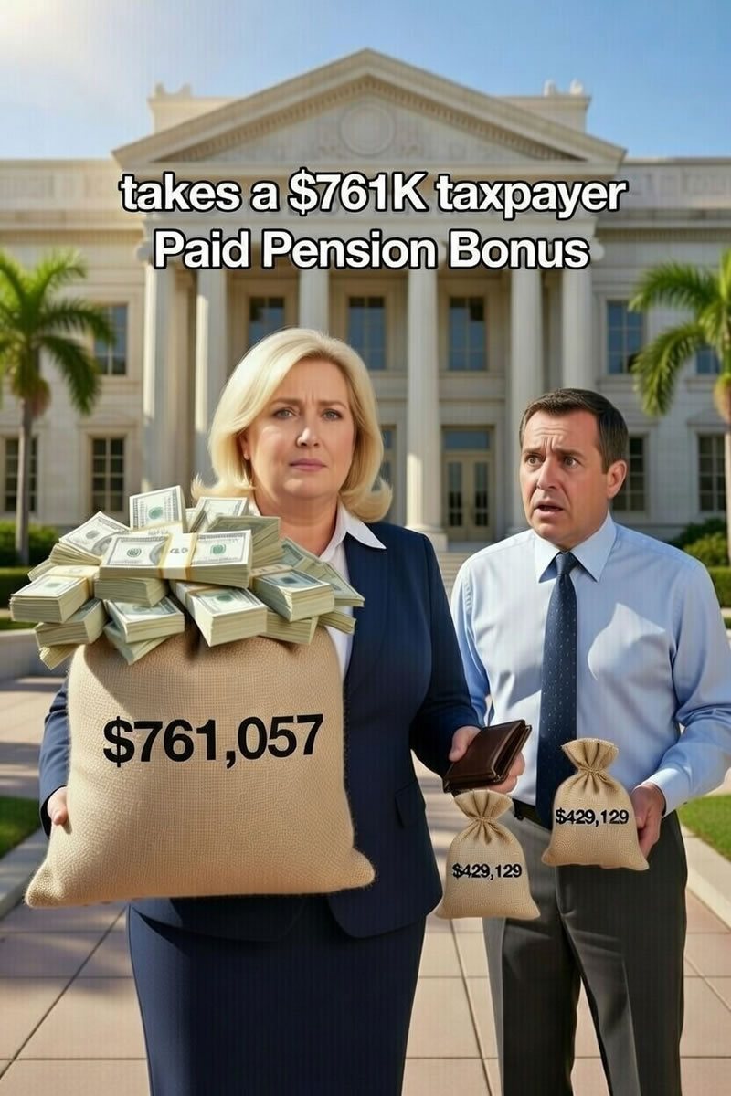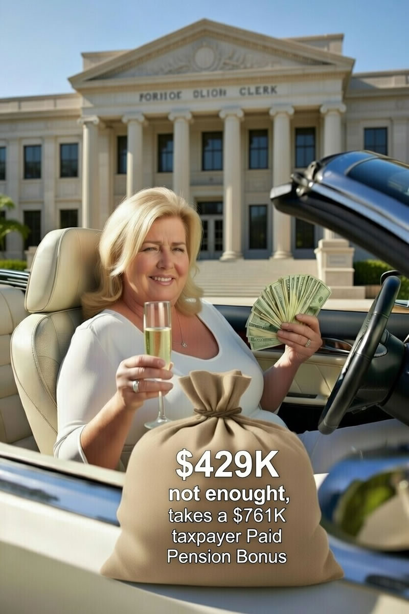 Martin County Clerk Carolyn Timmann has secured an extraordinary $761,067 pension cash bonus—on top of her $165,530 salary, $66,212 in annual benefits, and a lifetime pension boosted from $41,411 to approximately $73,442 per year. Timmann doesn’t pay the standard 3% of her salary ($4,965,9) to the Florida Retirement System shifting personal responsibility to taxpayers.